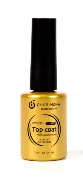 Top Coat Cherimoya, crea un acabado de alto brillo para finalizar el esmaltado permanente y sistemas de construcción como Gel, Soft Gel, Powder gel y sobre una superficie de acrílico, esto quiere decir que es un top universal, sella y protege ya que está especialmente diseñado para catalizar con un mínimo de contracción por lo que evita que se desgaste o descascare la uña, no se opaca si se respetan los tiempos correctos de catalización los cuales son 60 seg bajo luz uv led, sus Protectores UV aseguran que la aplicación del top coat no altere los colores y no pierdan brillo, el top coat cherimoya no necesita ser clarificado y no posee capa de inhibición.